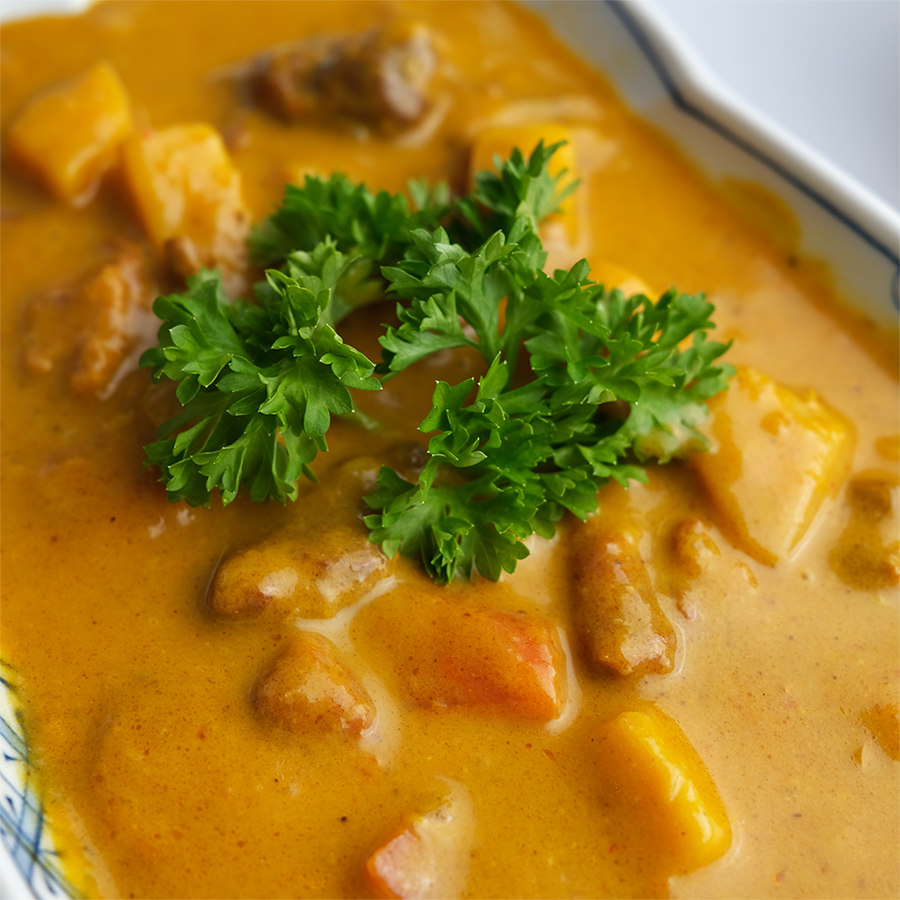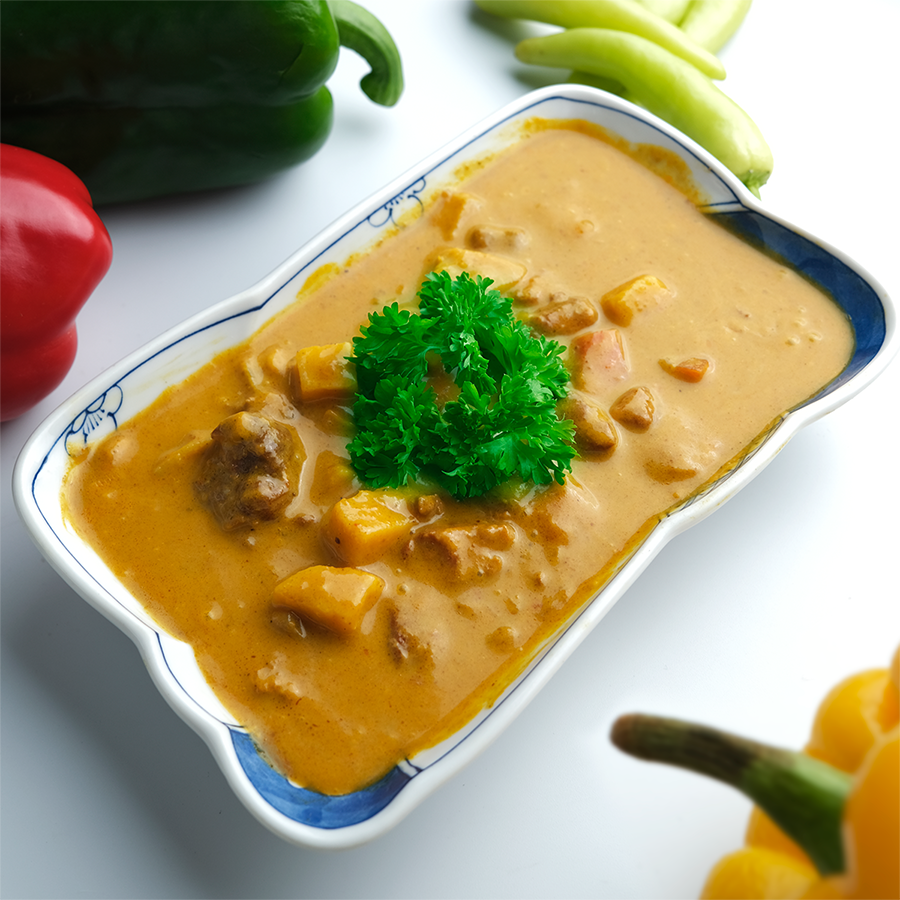 Nước sốt sánh mịn, thơm béo từ bột sữa dừa, đậm đà với các loại gia vị truyền thống: quế, hồi, sả, gừng, ớt…