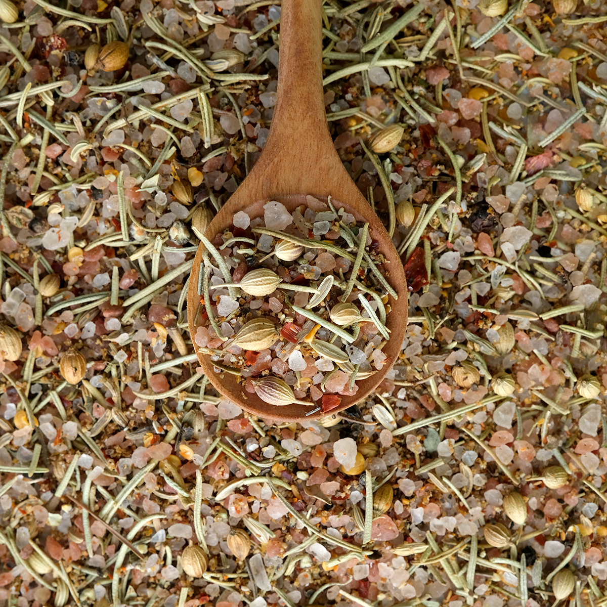 Chỉ số kết cấu: Hỗn hợp hạt muối hồng và các mảnh thảo mộc sấy khô.