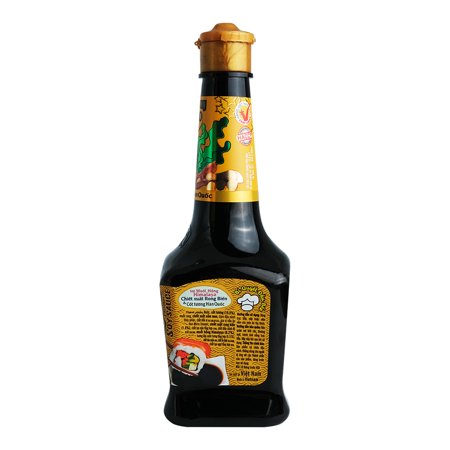 - Nước, cốt tương (15.5%), muối rang, chiết xuất nấm men, đạm đậu nành thủy phân, chất điều vị (621, 640, 627, 631), gia vị nấu ăn Hon Mirin Umami, chiết xuất rong biển (1.5%), chất tạo màu tổng hợp (150c), chất điều chỉnh độ acid (330, 260), muối hồng Himalaya (0.2%), hương liệu nước tổng hợp (0.15%), chất bảo quản, chất ổn định, chất tạo ngọt tổng hợp.